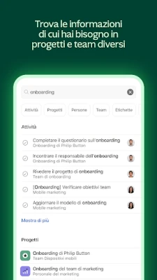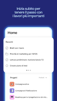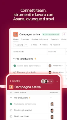 Libera il potenziale del tuo team e dei tuoi progetti, ovunque tu sia. Asana trasforma la gestione del lavoro da un'attività legata alla scrivania a un'esperienza fluida e accessibile su mobile e web. Che tu sia in viaggio o in ufficio, potrai concentrarti e mantenere il controllo. Definisci facilmente ogni progetto come uno spazio collaborativo, suddividendo gli obiettivi più grandi in attività chiare, assegnando la responsabilità e stabilendo scadenze precise. Scegli la visualizzazione che meglio si adatta al tuo stile di lavoro: elenchi dettagliati, bacheche Kanban intuitive o una chiara panoramica sul calendario.