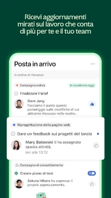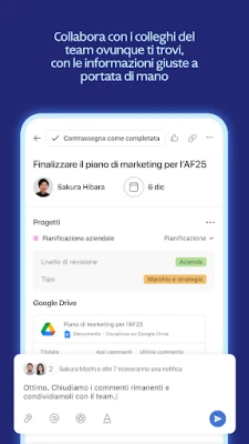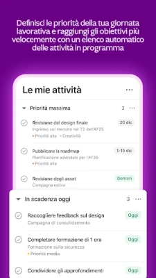 Massimizza la tua produttività individuale con la sezione "Le mie attività", un centro di comando personalizzato dove tutte le tue incombenze sono organizzate in un'unica lista. Prioritizzare è semplice: trascina le attività tra sezioni predefinite o crea le tue checklist personalizzate, ordinando i compiti secondo criteri specifici per mantenere il focus. La collaborazione rimane sempre attiva e coinvolgente: interagisci con il tuo team tramite reazioni, commenti o allegando file direttamente alle attività. Ricevi aggiornamenti automatici e puntuali sui progressi dei progetti e sulle attività di tuo interesse, direttamente nella tua casella di posta.