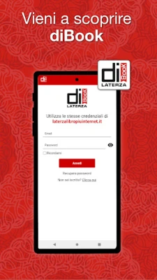 L'ingresso nel tuo spazio personale con diBook Laterza è semplice: utilizza le stesse credenziali del portale laterzalibropiuinternet.it per un accesso immediato. Una volta all'interno, troverai subito disponibili i manuali sbloccati, l'intera biblioteca digitale e le copie saggio dedicate ai docenti. diBook Laterza è il tuo alleato per elevare l'esperienza di apprendimento, offrendoti un ambiente di studio connesso, flessibile e sempre a portata di mano. Vivi il futuro della didattica digitale con Laterza.