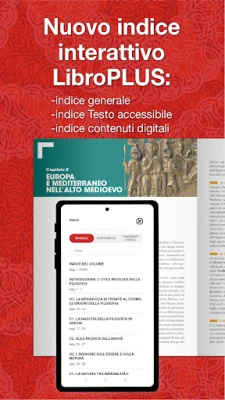 Trasforma il tuo approccio allo studio con diBook Laterza, l'innovativa piattaforma che porta la ricchezza dei manuali scolastici Laterza e i loro contenuti digitali direttamente sui tuoi dispositivi preferiti. Che tu sia su computer, smartphone o tablet, avrai accesso senza confini a una vasta biblioteca di risorse didattiche. diBook Laterza ti offre la flessibilità di consultare i testi in streaming o di renderli fruibili anche senza connessione, garantendo la continuità didattica. I manuali sono disponibili in formati evoluti e accessibili: sia nel classico ePub e PDF, forniti entrambi, sia nel rivoluzionario formato pagina LibroPlus, anch'esso con una versione studiata per l'accessibilità.