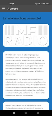 Ascolta MF RADIO e immergiti completamente nell'affascinante universo lusofono. Scopri un mondo vibrante di ritmi coinvolgenti e tradizioni uniche, con la migliore selezione di musica e contenuti culturali dal Portogallo, Brasile e oltre. MF RADIO ti porta il cuore della cultura lusofona, sempre a portata di mano.