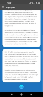 Ma l'esperienza MF RADIO va ben oltre la semplice playlist. È un vero e proprio spazio di convivialità e scoperta, dove potrai godere di programmi diversificati, interviste esclusive con artisti e approfondimenti sulle notizie locali. Concediti momenti di puro relax e arricchimento culturale, affrontando temi che spaziano dallo sport alla vita quotidiana, sempre con un tocco lusofono distintivo. MF RADIO ti invita a immergerti in un'atmosfera effervescente, ricca di cultura, dialoghi e infinite scoperte. Ascolta ovunque ti trovi, in qualsiasi momento, e lasciati avvolgere dall'energia che lega il Portogallo, la Francia e il mondo intero.