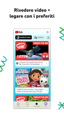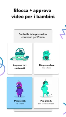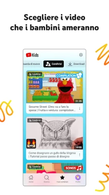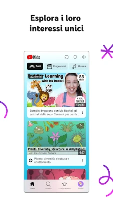 La serenità dei genitori è la nostra priorità, per questo YouTube Kids integra robusti strumenti di Controllo Genitori. Hai la facoltà di limitare ciò che i tuoi figli possono vedere, guidando attivamente la loro esperienza digitale. Le nostre opzioni di blocco dei contenuti sono pensate per mantenere l'ambiente sicuro e adatto alla famiglia, ma la scelta finale è sempre tua. Hai notato un contenuto che non ti convince? Puoi facilmente segnalarlo al nostro team per una revisione. E per promuovere abitudini equilibrate, la funzionalità "Timer" ti permette di impostare un limite di tempo per l'utilizzo dell'app, incoraggiando i bambini a fare una pausa e a portare le loro scoperte nel mondo reale.